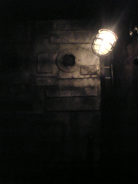 左の写真が入口です。あやしい丸窓と船用ライトがついた鉄製の重厚なドア。